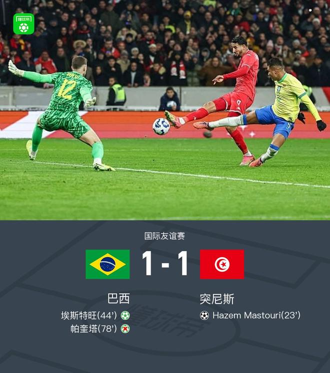 巴西队在一场国际友谊赛中对阵突尼斯队。比赛中,突尼斯人阿卜迪助攻,哈齐姆·马斯图里接球破门。巴西球员埃斯特万随后主罚点球扳平比分。下半场巴西队再次获得改变比分的机会,但帕奎塔的点球偏出。最终,两队握手言和,1-1战平。这场重要比赛第23分钟,马斯图里接队友传球破门。巴西队以0胜1负负于突尼斯队。第44分钟,突尼斯后卫禁区内伸手。埃斯特万主罚命中将比分扳平。巴西1-1突尼斯。第78分钟,罗克反击再添一分。帕奎塔主罚点球,但在高潮时罚失。两队球员均入场。比赛第10分钟,罗德里戈突破尝试射门,但门前被防守球员解围。第23分钟,马斯图里接队友传球破门。巴西队以0胜1负负于突尼斯队。第44分钟,突尼斯后卫禁区内伸手。埃斯特万主罚命中将比分扳平。巴西1-1突尼斯。第54分钟,萨阿德插上射门,但皮球擦着立柱。第64分钟,龙王寺被洪水淹没!达尼洛落地时踩了埃斯特班一脚。第78分钟,罗克反击再添一分。帕奎塔主罚点球,淘汰了本队阵容的技术统计。