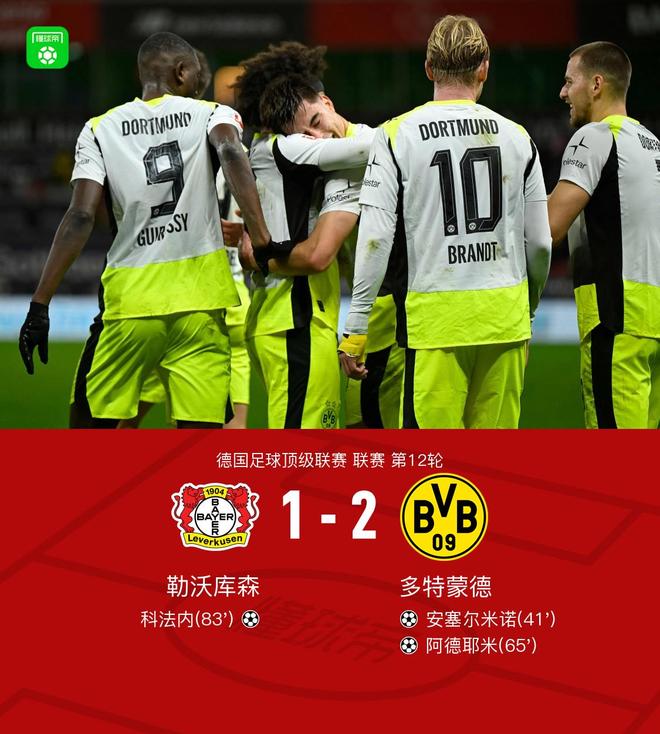 凌晨 1:30北京时间11月30日,德甲第12轮比赛继续进行。勒沃库森在拜耳竞技场迎战多特蒙德。裁判是托比亚斯·维尔茨。上半场,安塞尔米诺突破对手防守,头球破门。下半场,法比奥·席尔瓦助攻阿德耶米头球破门,科法内为勒沃库森进球。最终,多特蒙德2-1击败勒沃库森。重要赛事第41分钟,安塞尔米诺突破防守头球破门,多特蒙德1-0获胜!第65分钟,法比奥·席尔瓦传中助攻,阿德耶米头球破门,多特蒙德2-0。第83分钟,马扎传球,科法内巧妙射门破门。勒沃库森1-2重获胜利!第10分钟,两队球员登场,战斗一触即发。波库进入禁区并进球。球越过了横梁。第22分钟,霍夫曼接球低射。球击中门柱。第36分钟,塔普索巴禁区内接球破门。球飞了起来。第45分钟,波库突然外线冷箭射出,球被扑出。第54分钟,冲和瑞尔森阻挡犯规,吃到黄牌。第55分钟,马利克·蒂尔曼将球扔向球门,但皮球险些偏出立柱。第59分钟,吉拉西上前发现球门后摇头。弗雷肯前来救援。第71分钟,霍夫曼的射门击中横梁。第72分钟,布兰特试图单刀破门,但皮球擦着立柱。球队阵容技术统计