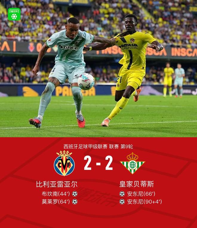 北京时间10月19日,西班牙足球甲级联赛第9轮比赛,比利亚雷亚尔主场迎战皇家贝蒂斯。比利亚雷亚尔的布坎南进球,莫雷洛进球。安东尼为皇家贝蒂斯攻入两球。最终比分:比利亚雷亚尔2-2皇家贝蒂斯。关键时刻,平衡在第44分钟被打破。布坎南外线得分。比利亚雷亚尔1-0。第65分钟,科梅萨尼亚助攻莫雷洛进球。第66分钟,比利亚雷亚尔2-0重新获胜。安东尼接到球。进球,90分钟+4分钟贝蒂斯1-2,2球,安东尼补时追平,伟大时刻贝蒂斯2-2,球员入场,比赛即将开始,裁判吹响后,西甲球员保持沉默并抗议,外线比赛第10分钟,莫莱罗外线尝试远射,皮球没有进门,第44分钟,布坎南首开纪录和 进球了。比利亚雷亚尔1-0。第52分钟,瓦伦丁·戈麦斯头球攻门球打到了球门,但球被守门员挡住了。第65分钟,他们再次获胜。梅萨尼亚助攻莫雷洛进球,比利亚雷亚尔第66分钟2-0,曼城落后,安东尼触球破门,贝蒂斯1-2,90分钟2球+4分钟,安东尼补时扳平比分,贝蒂斯2-2球队阵容技术统计