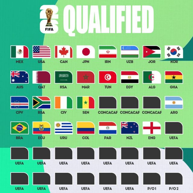 11月份的国际足联比赛期本周正式开始,世界杯席位之争仍在继续。目前,已有28支球队确认了2026年世界杯的参赛资格。另外14支球队将于11月13日至18日晋级,这也是直接参加世界杯的最后14个名额。还剩六个名额,由欧洲附加赛(四队)和洲际附加赛(两队)决定。 12月5日,国际足联将进行世界杯小组赛抽签。 【晋级世界杯的28支球队】 场地(3):美国、加拿大、墨西哥 欧洲区(1/16):英格兰 亚洲区(8/8):日本、伊朗、韩国、乌兹别克斯坦、约旦、澳大利亚、卡塔尔、沙特阿拉伯 南美区(6/6):阿根廷、厄瓜多尔、巴西、哥伦比亚、乌拉圭、巴拉圭 非洲区(9/9):摩洛哥、突尼斯、埃及、阿尔及利亚、加纳、佛得角、南非非洲、科特迪瓦、塞内加尔 大洋洲(1/1):新西兰兰达【亚洲区】共8支球队晋级吃到了亚洲区,资格赛已经进入第五轮。阿联酋队与伊拉克队的第二轮比赛将于11月13日至18日进行,胜者将晋级洲际附加赛。 【非洲区】直接参加世界杯的9个名额已公布。本届世界杯,尼日利亚将对阵加蓬,喀麦隆将对阵民主刚果。一支球队将有资格参加洲际季后赛。 【南美】六支球队已公布,玻利维亚将晋级洲际附加赛。 【欧洲:本月11支球队晋级】英格兰成为欧洲第一支晋级世界杯的球队。目前积分榜上,挪威以六场六胜的成绩位列第一组,领先意大利三分,距离世界杯预选赛已经很近了。葡萄牙在还剩两场比赛的情况下以5分的优势位居积分榜榜首,距离出线仅差一场胜利2026年世界杯。 A组的德国队(4场比赛积9分)和斯洛伐克队(4场比赛积9分)将在本届FIFA锦标赛中决定自己的名次。 B组的瑞士队在四场比赛中积10分,有望获得本月世界杯的参赛资格。 C组的丹麦和苏格兰有四场比赛。他们将在比赛中积10分,争夺直接晋级名额。 D组的法国队四轮比赛积10分,距离世界杯预选赛已经很近了。西班牙队在E组四场比赛中积12分,有望晋级本周的世界杯。 G组的荷兰、H组的奥地利和L组的克罗地亚也是出线的有力候选者。 【中北美及加勒比地区足联:本月有3支球队晋级】中北美洲及加勒比地区预选赛已晋级第三轮。各队将通过11月13日和18日的两场比赛直接晋级世界杯。A组的竞争非常激烈。苏里南和巴拿马四场比赛积六分,而危地马拉则四场比赛得五分。还剩两轮比赛,大家都希望能够以小组第一的身份直接晋级世界杯。 B组中,牙买加4战积9分,库拉索4战积8分。两支球队都希望能够首次直接进入世界杯。 C组中,洪都拉斯四场比赛积8分,哥斯达黎加四场比赛积6分,海地四场比赛积5分,争夺小组第一。三个小组中,成绩最好的两个小组的第二名将获得洲际附加赛的资格。